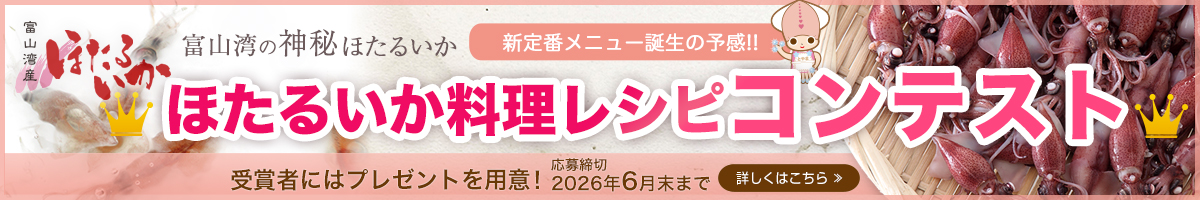 富山県産ホタルイカの知名度向上と消費拡大を目的に「ほたるいか料理レシピ」を募集します。受賞者にはプレゼントを用意!料理人や一般参加者の創意工夫によるレシピをお待ちしております。